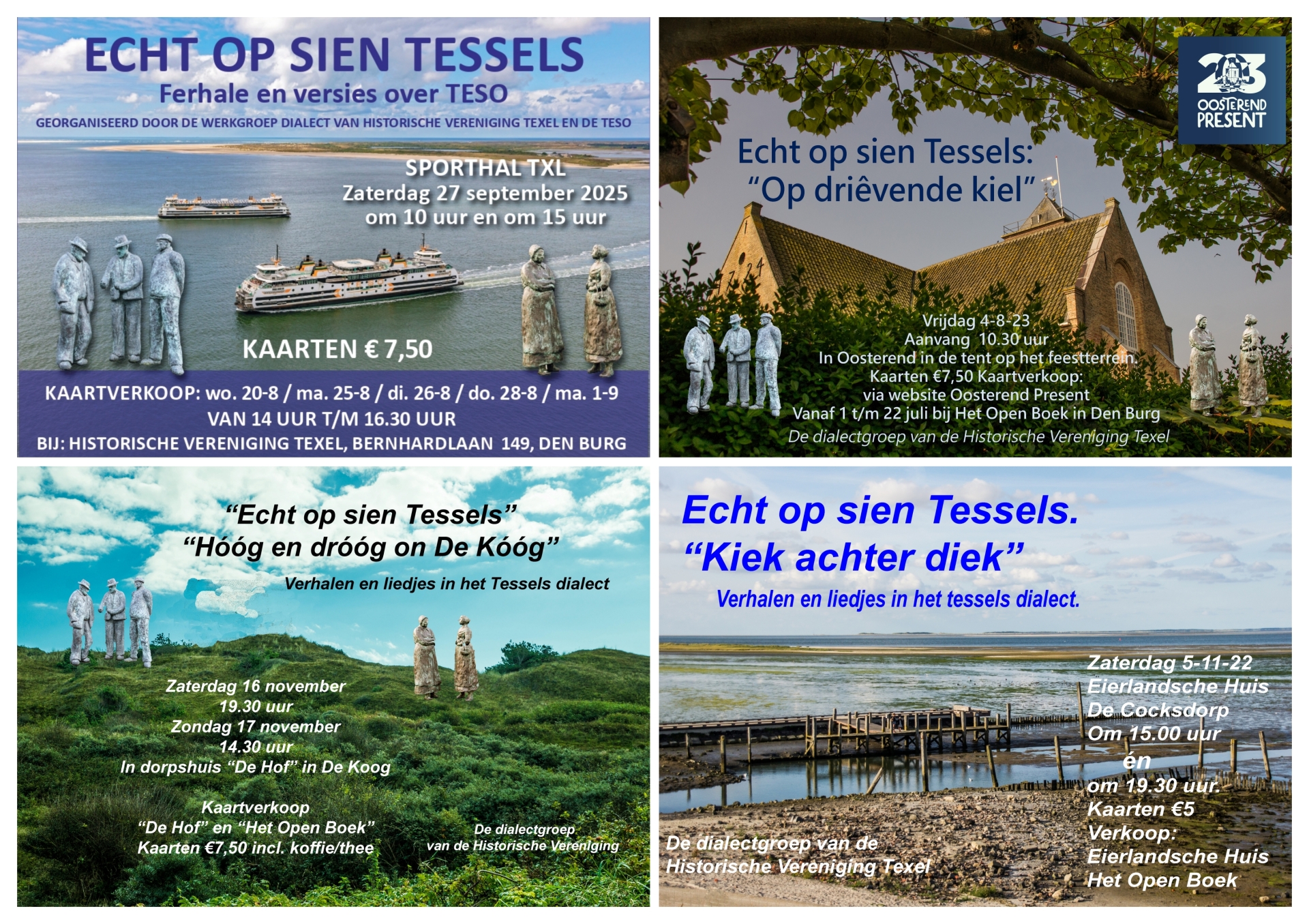 In 2011 is uit de Dialectgroep ‘Echt op sien Tessels’ ontstaan. Sindsdien organiseert die ieder jaar, met medewerking van dorpsgenoten, in de herfst een uitvoering in één van de dorpen op Texel. Met veel succes, zodat we nu inmiddels aan de tweede ronde bezig zijn.